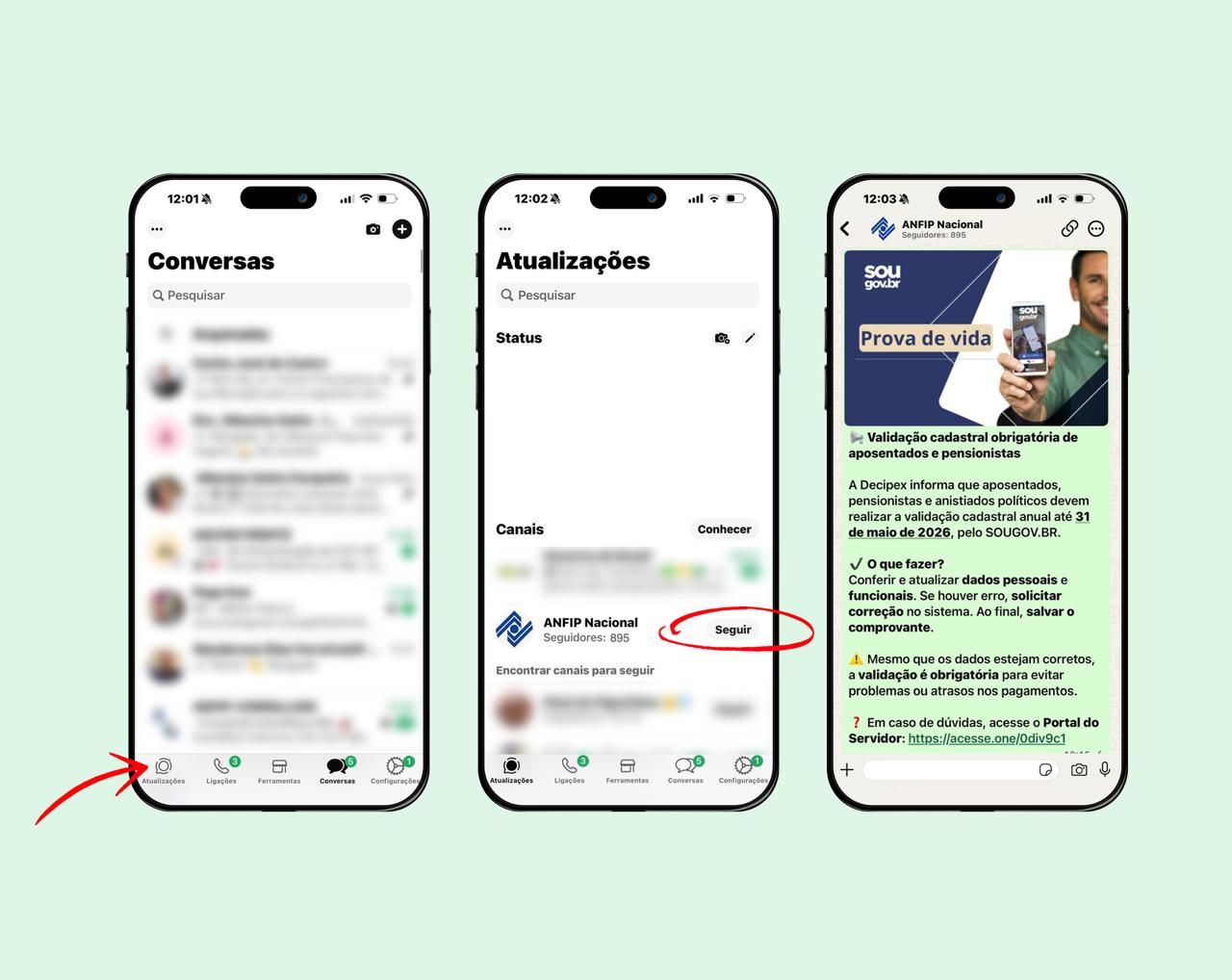 ATENÇÃO: as mensagens do canal não aparecem na aba de conversas. Para visualizar as notícias, é necessário acessar a aba “Atualizações” dentro do WhatsApp.