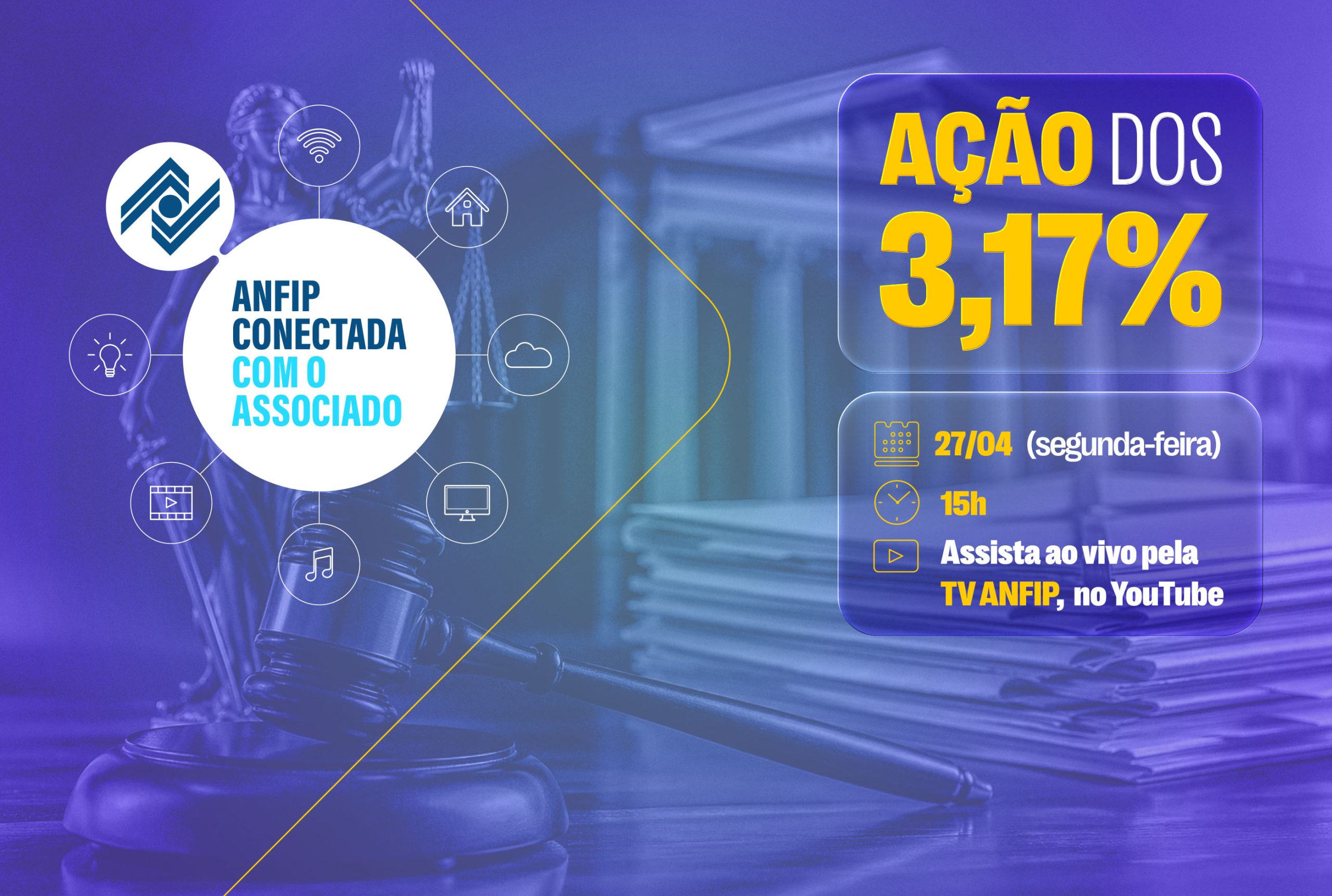 A ANFIP Nacional, por meio de sua Vice-Presidência de Assuntos Jurídicos, convoca todos os exequentes da ação relativa aos 3,17% a participarem de live que será realizada na próxima segunda-feira, dia 27 de abril, às 15 horas, com transmissão pela TV ANFIP, o canal do YouTube da Entidade.