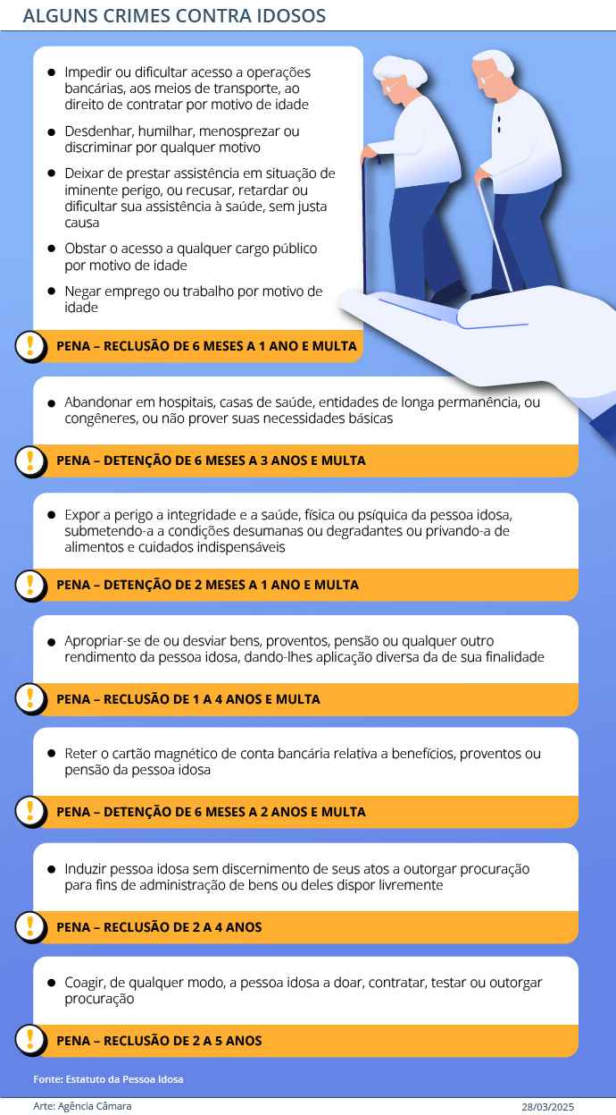A lei também tipifica crimes específicos contra estes cidadãos. São exemplos: impedir ou dificultar acesso a operações bancárias e meios de transporte por motivo de idade; humilhar ou menosprezar a pessoa idosa; deixar de prestar assistência em situação de perigo; abandonar idosos em hospitais ou entidades de longa permanência; apropriar-se ou desviar bens e rendimentos; reter cartão magnético relativo a benefícios; induzir idoso sem discernimento a outorgar procuração; e coagir a doar ou contratar. As penas variam de detenção e multa até reclusão de um a cinco anos, conforme a gravidade da infração.