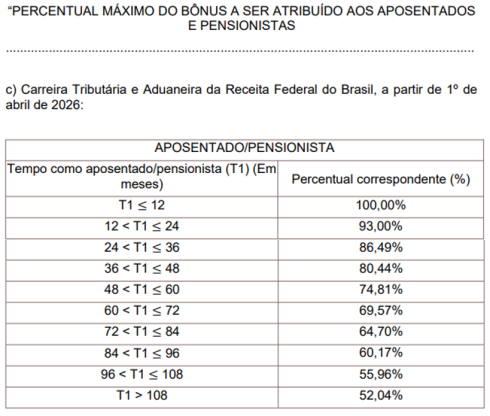 O texto aprovado também promove correção parcial nos percentuais do Bônus de Eficiência e Produtividade da Administração Tributária e Aduaneira pagos a aposentados e pensionistas, uma demanda histórica das entidades representativas da categoria. Atualmente fixado em 35%, o percentual passará para 52,04% a partir de abril de 2026, igualmente com reflexos financeiros em maio.