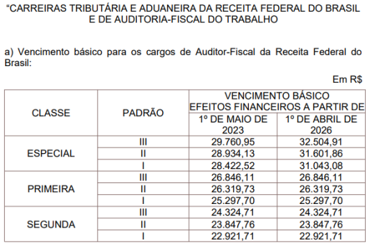 Entre os principais impactos da nova legislação está o reajuste de 9,22% no Vencimento Básico (VB) das últimas classes da tabela remuneratória dos cargos de Auditor Fiscal da Receita Federal do Brasil (AFRFB) e Analista Tributário da Receita Federal do Brasil (ATRFB).