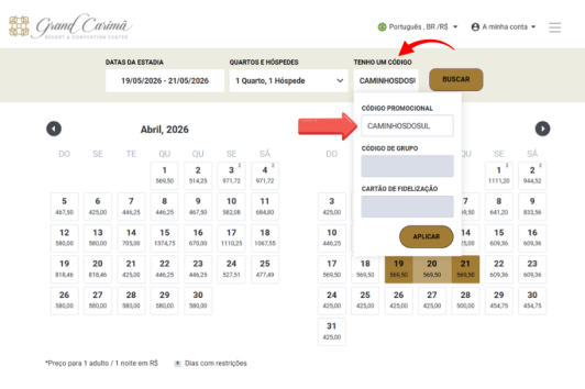 A hospedagem é de responsabilidade dos participantes. O Grand Carimã Resort & Convention Center, hotel sede do evento, oferece tarifas especiais para os inscritos, mediante a utilização do código CAMINHOS DO SUL no momento da reserva, que pode ser feita no site https://grandcarima.com.br. A escolha de outras opções de hospedagem é livre, porém os descontos são exclusivos para o hotel oficial, que conta ainda com amplo estacionamento.
