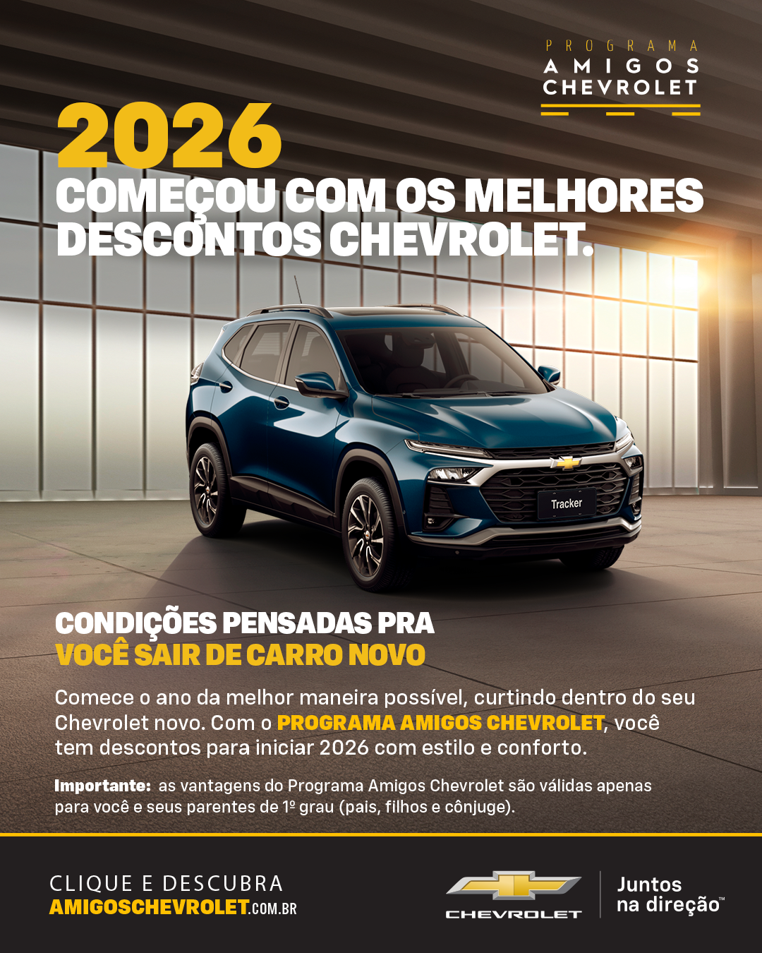 Para conferir todos os descontos disponíveis e acessar os bônus de cada veículo, basta entrar na página inicial do Programa Amigos Chevrolet: https://www.amigoschevrolet.com.br/start/landing.